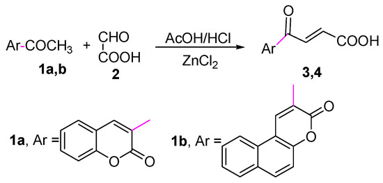 In the present investigation we report the syntheses of some new coumarin derivatives having antitumor and antioxidant activities. 4-Oxo-4-(2-oxo-2H-chromen-3-yl)but-2-enoic acid (3) was synthesized by Tolstoluzhsky et al. [] using glyoxalic acid and acetic anhydride in the presence of ytterbium triflate as a catalyst under microwave conditions. Herein we synthesized the target compounds 3 and 4 by the reaction of 3-acetyl-2H-chromen-2-one (1a) and 2-acetyl-3H-benzo[f]-chromen-3-one (1b) with glyoxalic acid (2) in acetic acid/HCl to afford 4-oxo-4-(2-oxo-2H-chromen-3-yl)but-2-enoic acid (3) and 4-oxo-4-(3-oxo-3H-benzo[f]chromen-2-yl)but-2-enoic acid (4), respectively (Scheme 1). The IR spectra of compounds 3 and 4 showed characteristic absorption bands at 3446, 3476 cm−1 attributable to OH and also in the range 1730–1656 and 1742–1642 cm−1 attributable to C=O, respectively. 1H-NMR spectra of compounds 3 and 4 showed exchangeable signals at δ 12.51, 9.40 ppm, respectively, assigned to the OH protons. The mass spectra of compounds 3 and 4 showed the molecular ion peak at m/z 244 and a [M + 2]+ peak at m/z 296, respectively which coincide with the molecular weights supporting the proposed identity of the structures.