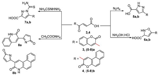 Compounds 3 and 4 were reacted with hydrazine hydrate [] to yield the pyrazolecarboxylic acid derivatives 5a and 5b, respectively, via aza Michael addition followed by cyclization (Scheme 2). The spectroscopic data are consistent with the proposed structures. The IR spectra of compounds 5a and 5b showed bands for acidic OH and NH protons at 3440, 3217, 3400 and 3283 cm−1 respectively. The 1H-NMR spectra showed the appearance of OH protons at δ 11.03 and 12.82 ppm and NH protons at 7.01 and 6.99 ppm for compounds 5a and 5b respectively indicated the presence of the carboxylic and the NH groups.
