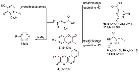 On the other hand, sodium azide reacted with compounds 3 and 4 to yield the triazine derivatives 13a and 13b. The reaction occurred via addition reaction on the carbon double bond followed by ring closure, elimination of water molecule and decarboxylation to give the stable compounds 13a and 13b. The structures of compounds 13a and 13b were confirmed based on spectral data. The IR showed bands for C=O and C=N at 1718, 1707 and 1631, 1624 cm−1, respectively and the absence of bands corresponding to OH and NH groups. The 1H-NMR spectra showed the absence of signals corresponding to NH and OH protons, and showed signals for coumarin, aromatic and two =CH protons in the range 8.89–6.42 ppm.
