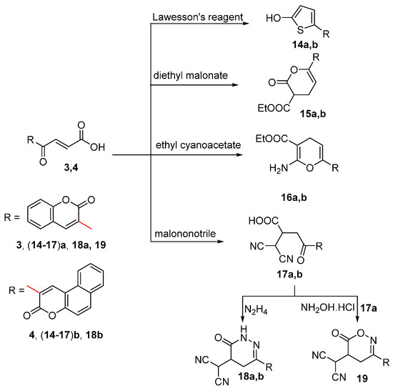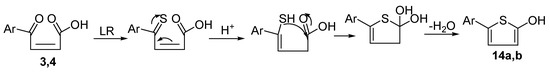 The reaction seems to produce like Paal-Knorr synthesis mechanism to produce the thiophene ring (Scheme 4). Proof of the structures of compounds 14a and 14b were based on spectral data. The IR spectra showed bands attributed to OH and C=O at 3557, 3428 and 1724 cm−1, respectively. The 1H-NMR showed signals for aromatic, coumarin proton, two =CH and OH protons at 7.61–7.54, 7.37–8.64, 6.91, 6.96, 7.14 and 6.20 ppm respectively. The mass spectra of compounds 14a and 14b showed the molecular ion peaks at m/z 261 and 310, respectively, which coincide with their molecular weights.