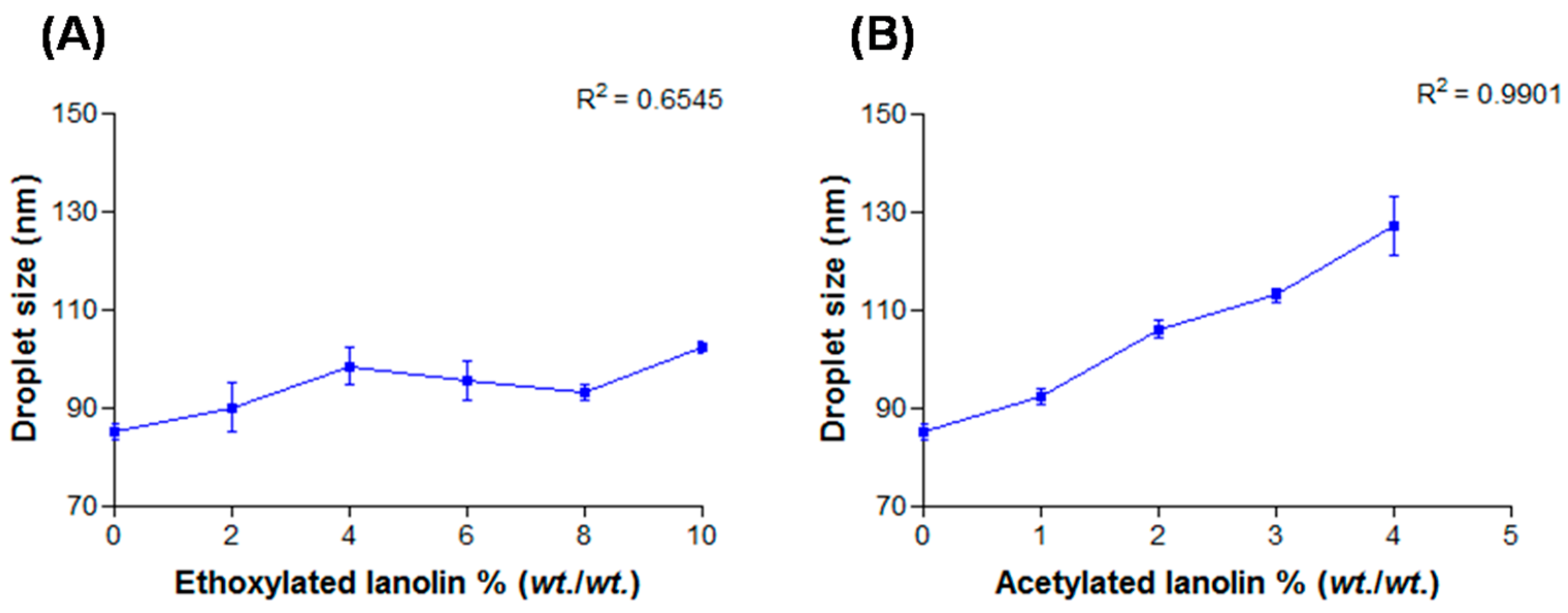 3.2.3. Lanolin Derivatives’ Addition in Nanoemulsions