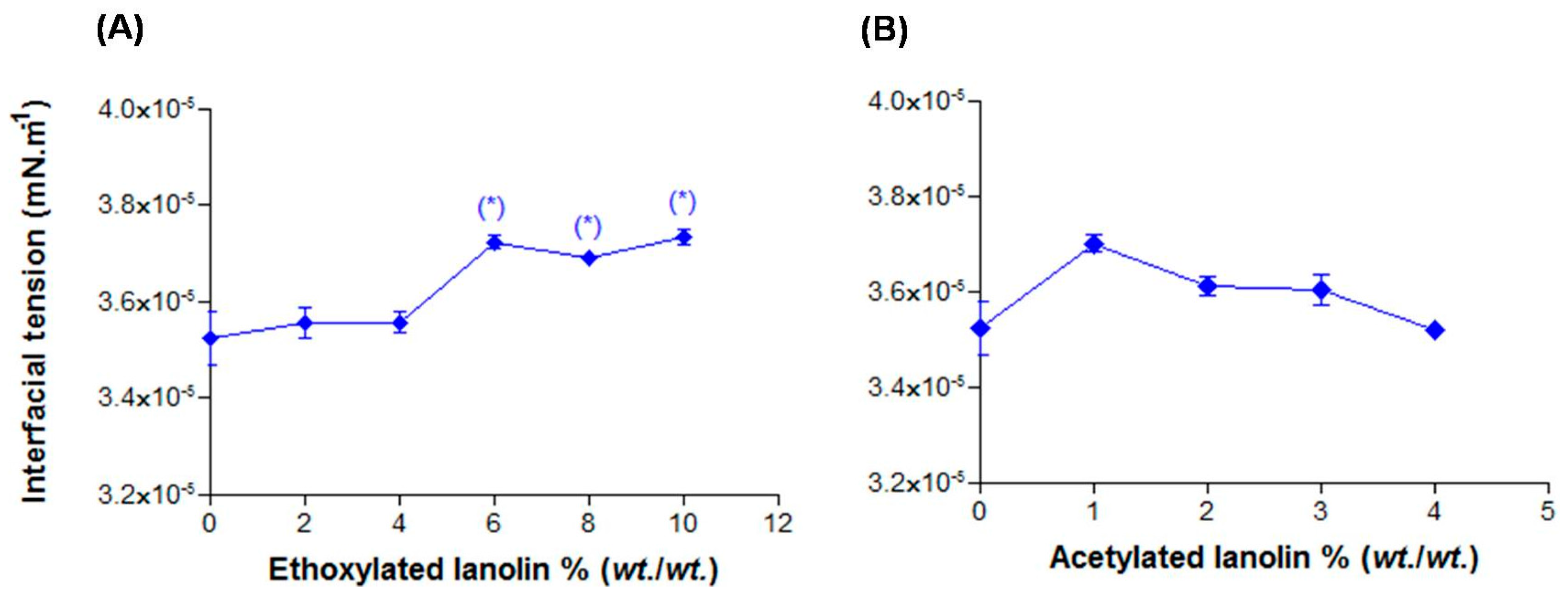 Interfacial tension in function of the lanolin derivatives: (A) EL and (B) AL. * p > 0.05.