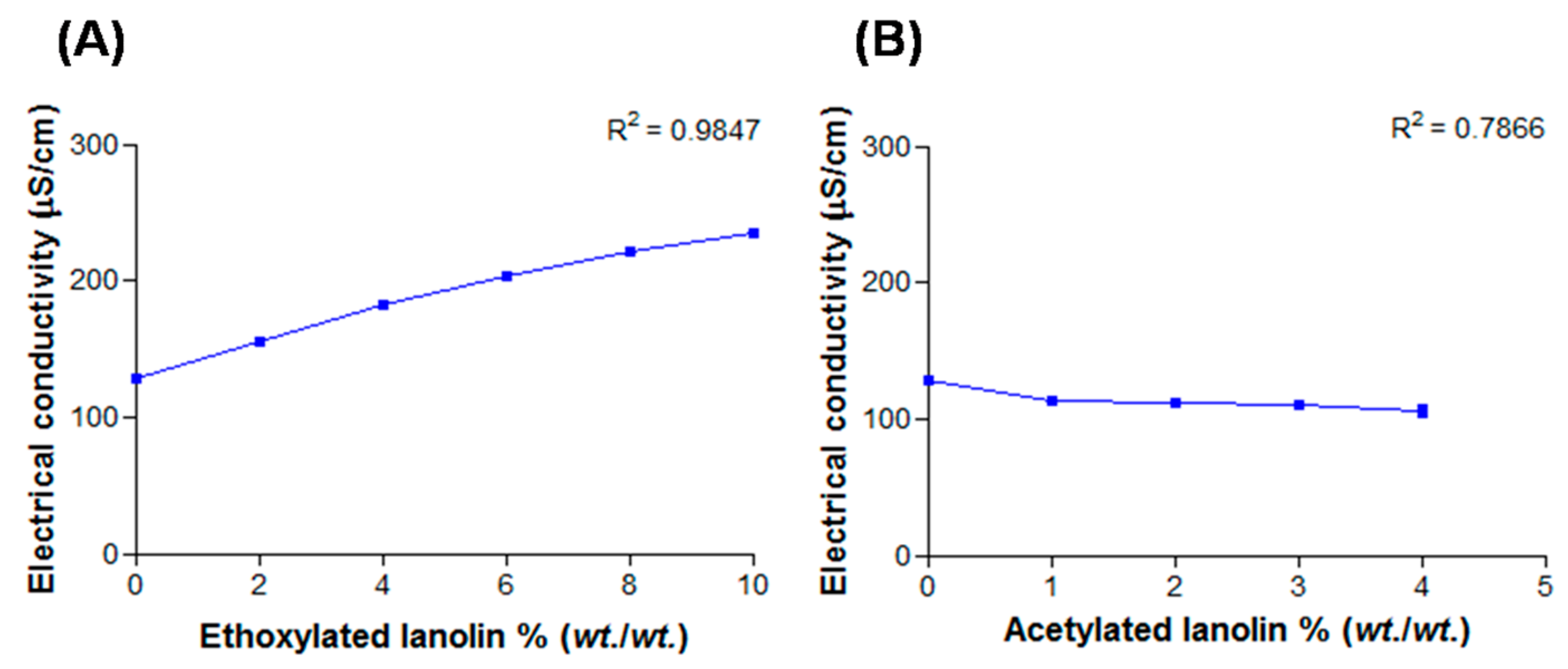 Electrical conductivity values in function of lanolin derivatives: (A) EL and (B) AL.
