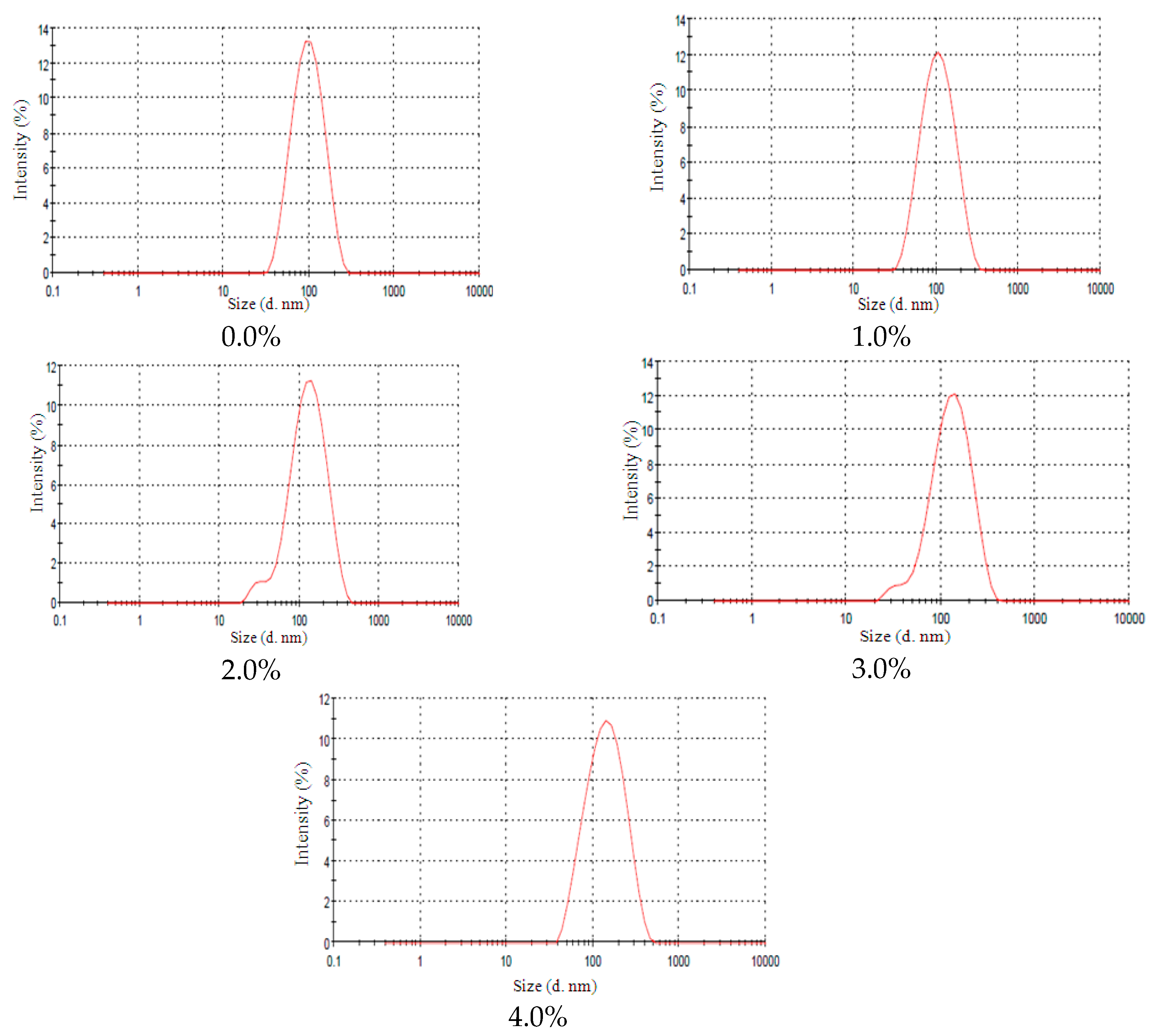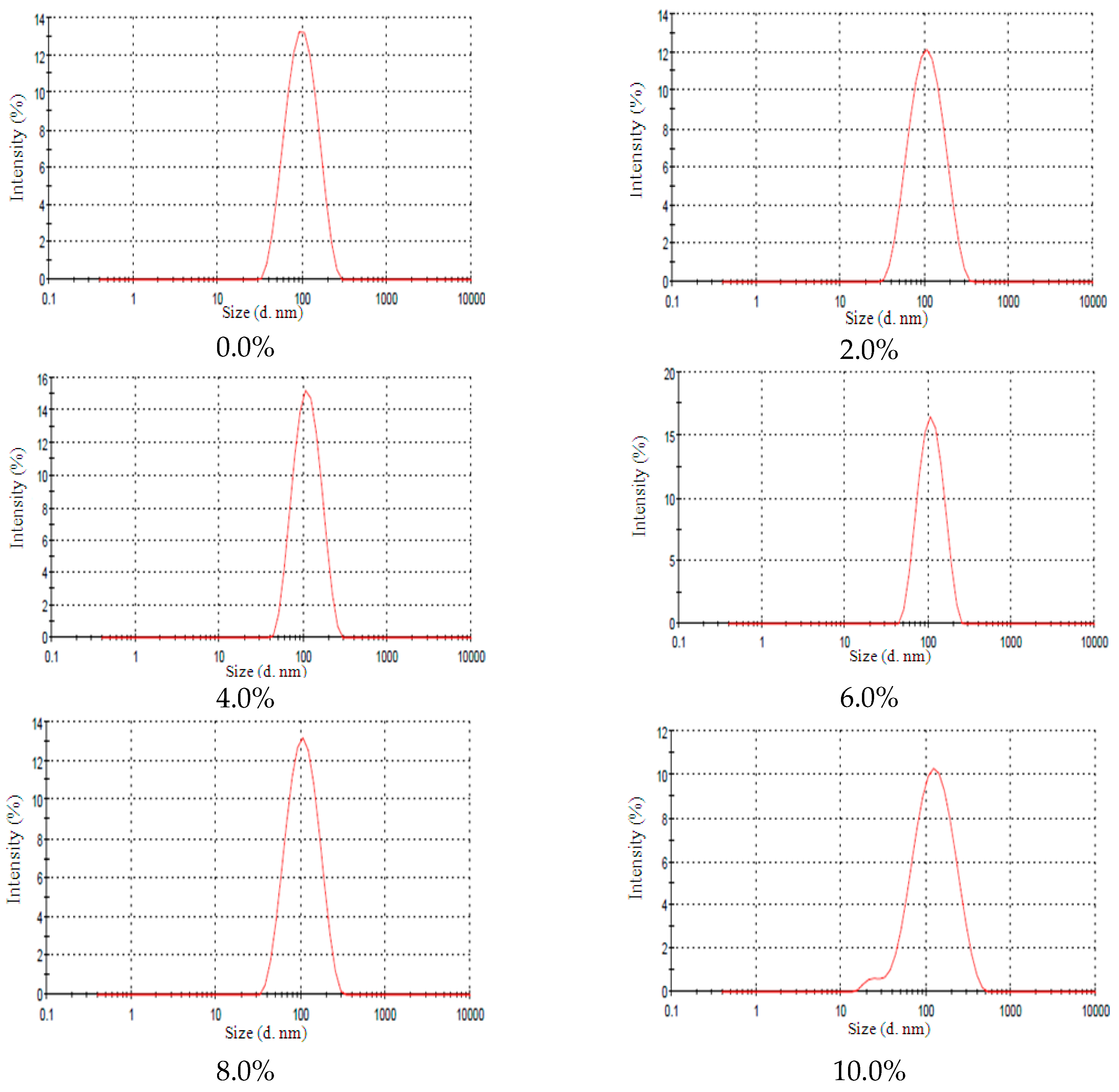 NE-EL size distribution at different EL concentrations (0.0%; 2.0%; 4.0%; 6.0%; 8.0% and 10.0%).