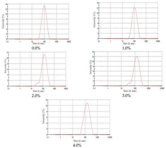 NE-AL size distribution at different EL concentrations (0.0%; 1.0%; 2.0%; 3.0%; 4.0% and 5.0%).
