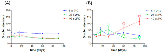Droplet mean sizes in function of time of nanoemulsions with added lanolin derivatives subjected to different storage temperatures: (A) EL and (B) AL. * p > 0.05.