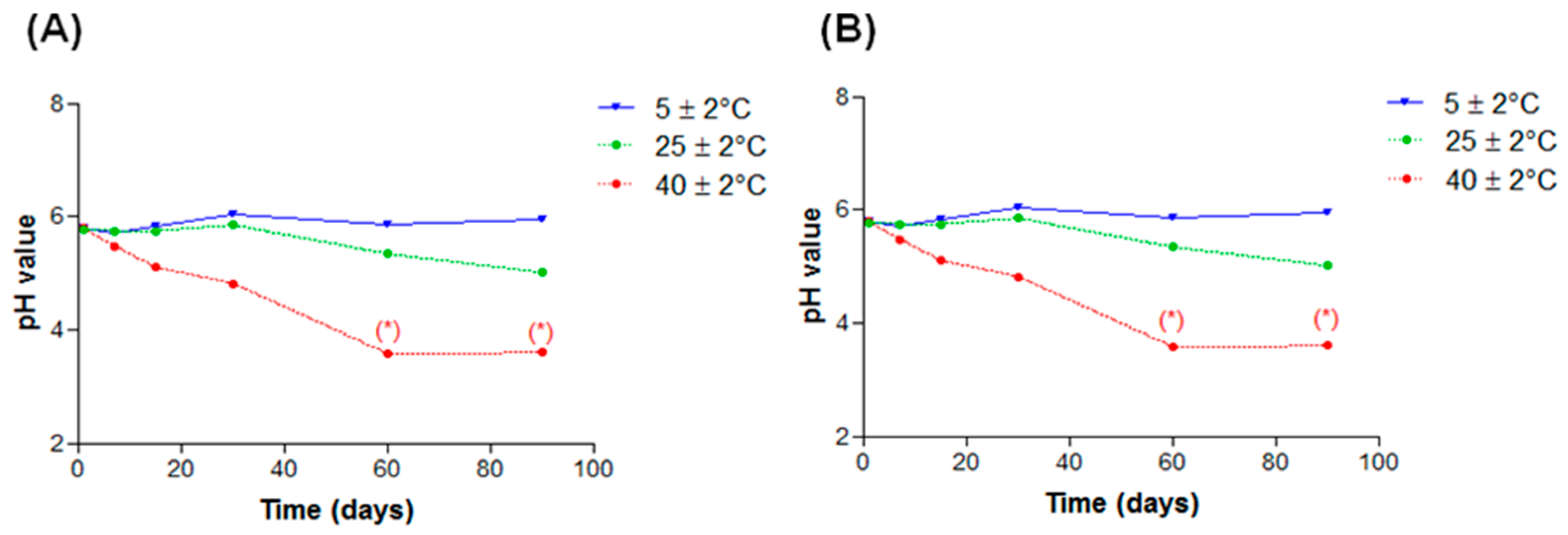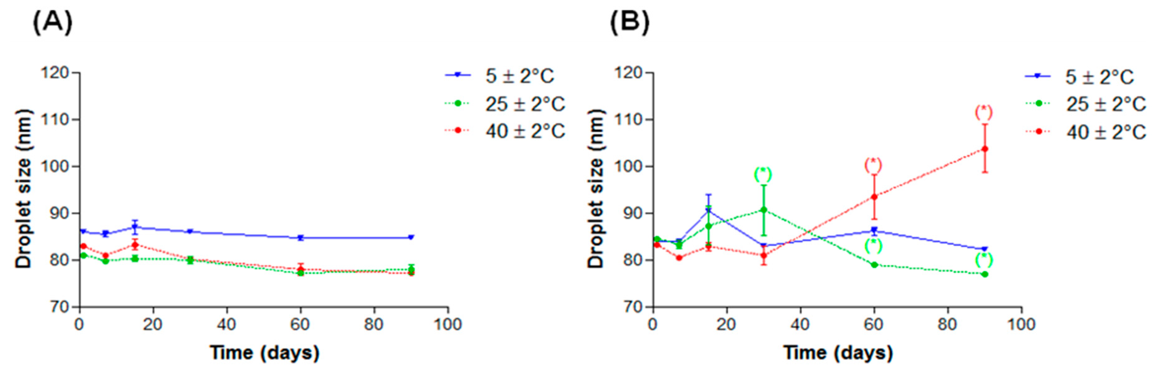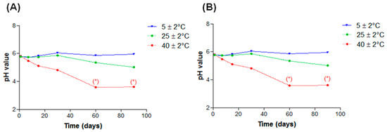 pH values in function of time of nanoemulsions subjected to different storage temperatures: (A) EL and (B) AL. * p < 0.05.