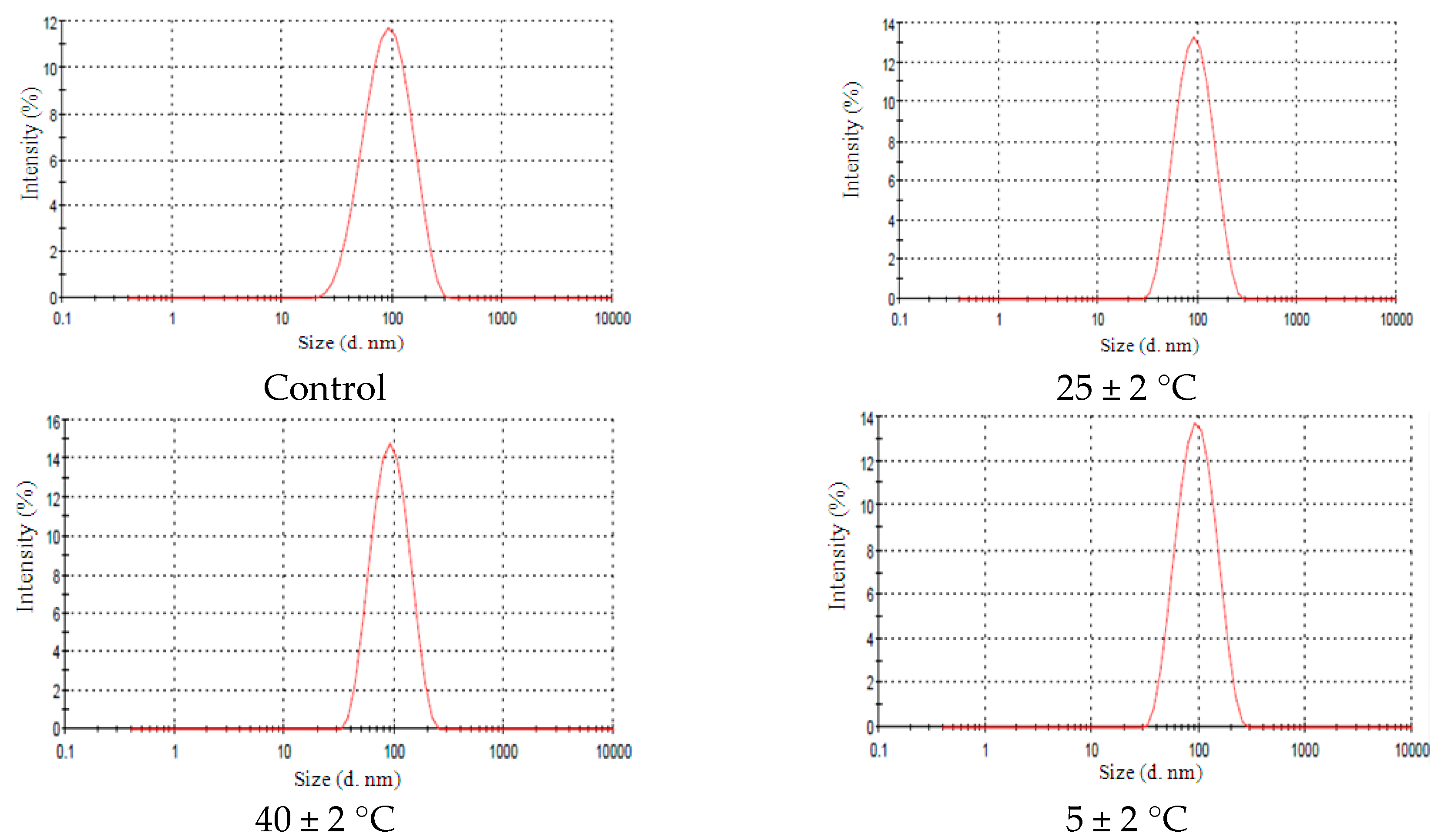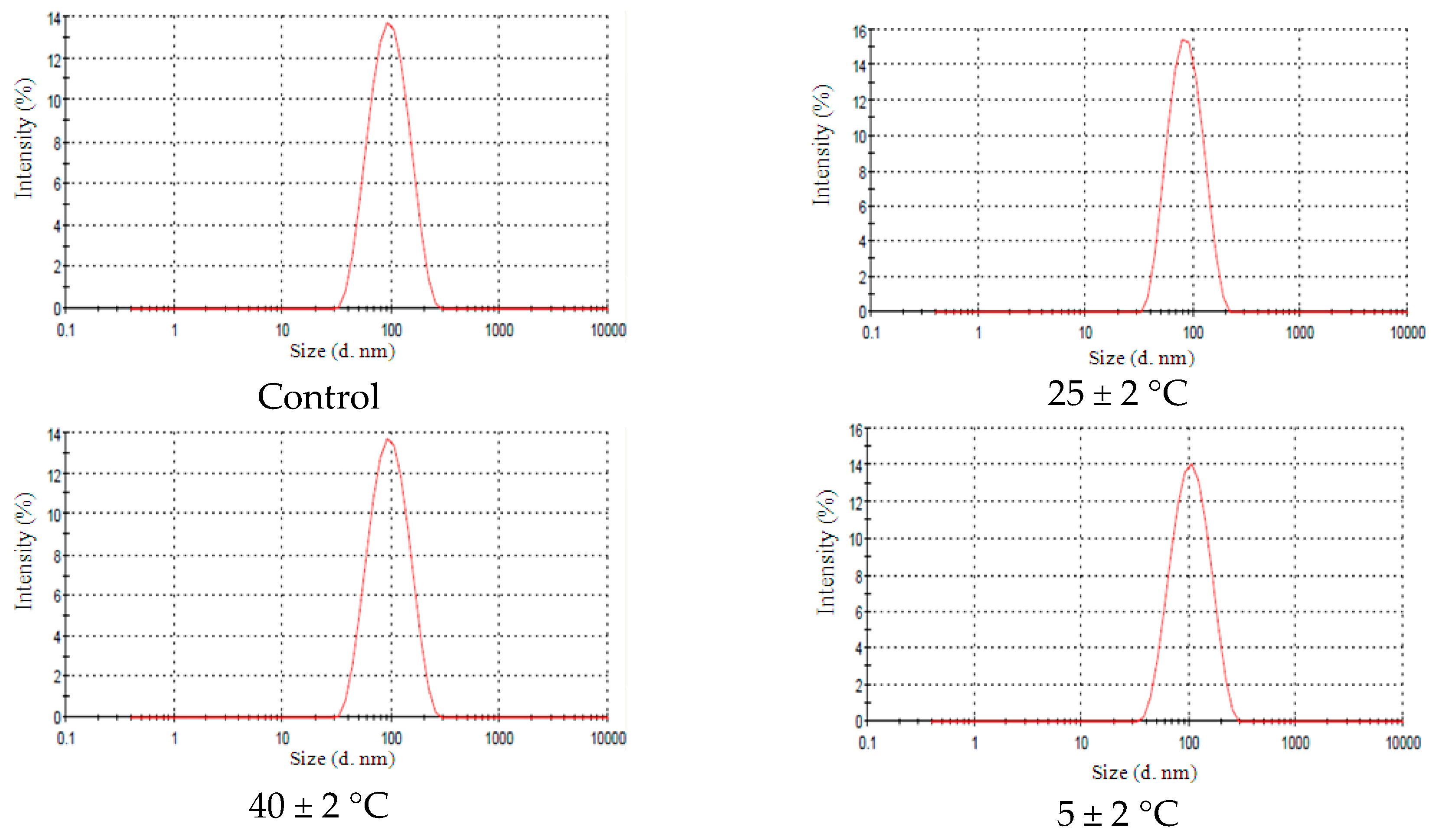 Narrow droplet size NE-AL 2% distribution under different conditions after 90 days of storage. Control curve refers to initial time (0 day), 25 ± 2 °C refers NE-EL 6% stored at room temperature. 40 ± 2 °C refers NE-EL 6% stored at high temperatures and 5 ± 2 °C refers NE-EL 6% stored at low temperatures.