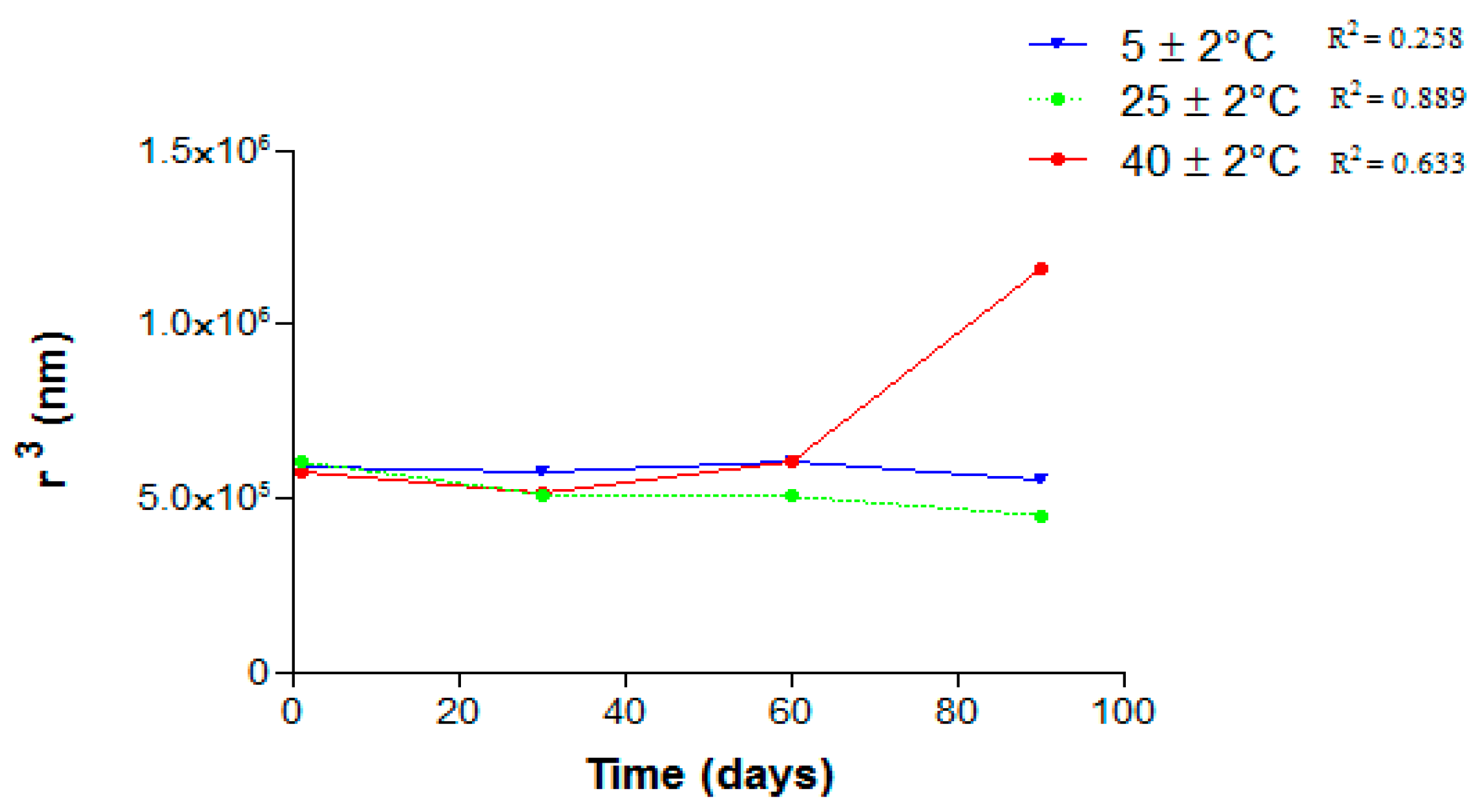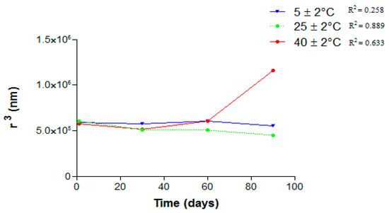 No linear relationship was observed between r3 and time, indicating that the instability phenomena that lead to the droplet size increasing is coalescence (Figure 9). High temperatures can decrease the systems’ apparent viscosity and increase the kinetic motility of the dispersed phase or surfactant agent. This could promote creaming and droplets coalescence [22]. When those nanoemulsions were stored at 25 ± 2 °C there was an increase of the droplet sizes followed by a decrease over time. Surfactants present in the system may be adsorbed on the droplet surface or dispersed in the aqueous solution as micelles or monomers. Molecules of the oil can be transferred from the inner phase to outer aqueous phase, causing droplets shrinking. Another phenomenon that may be occurring is a transfer of mass from small droplets to larger ones, called Ostwald ripening. The changes in the droplets sizes are a balance between solubilization and mass transfer, so as a rate overcomes the other, we can observe a decrease or increase of the droplet size [23].