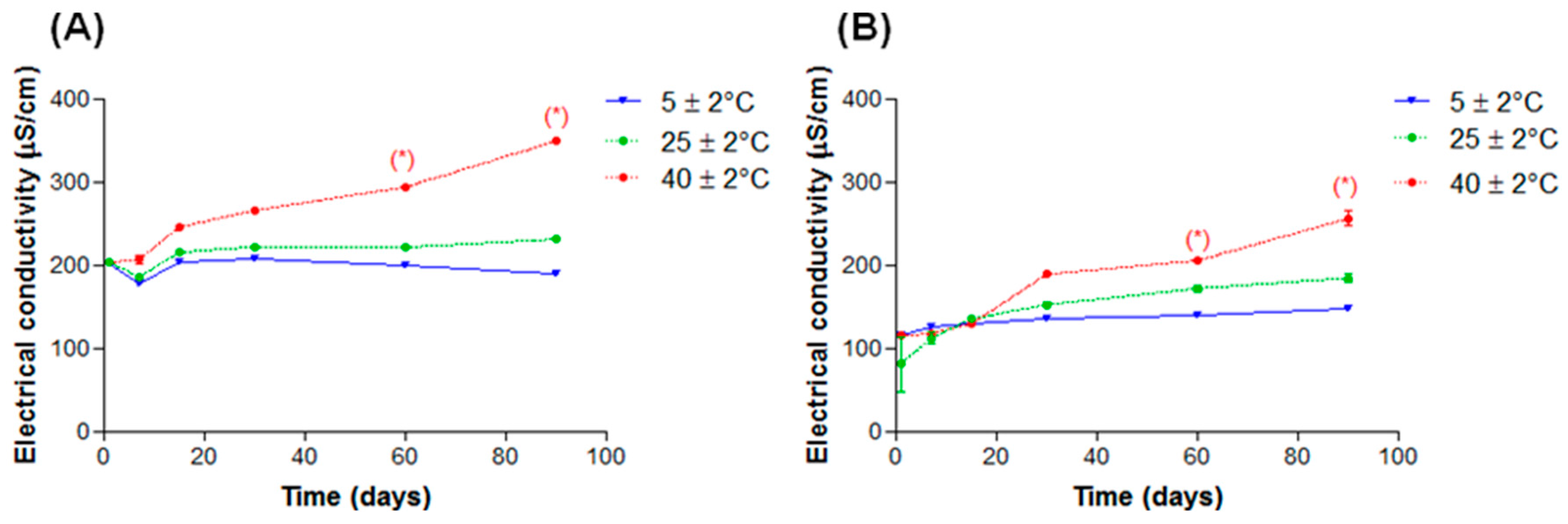 Electrical conductivity in function of time of nanoemulsions subjected to different storage temperatures, (A) EL and (B) AL. * p < 0.05.