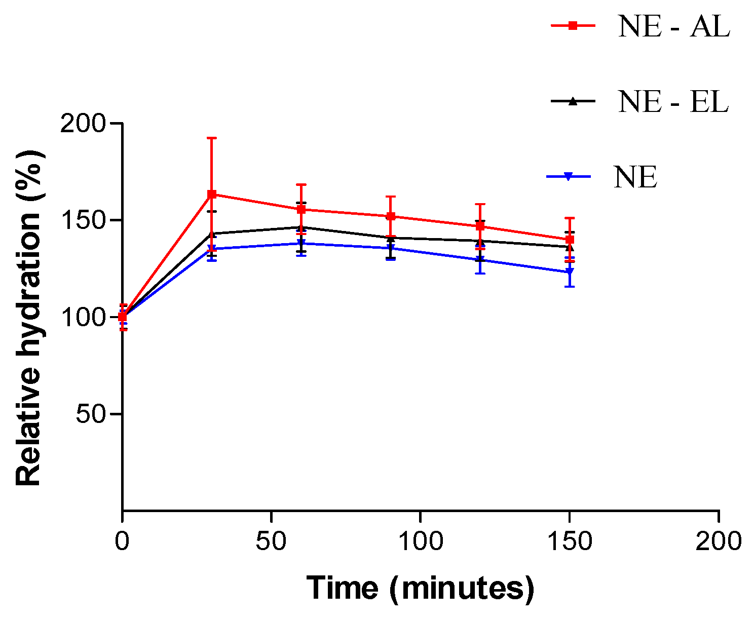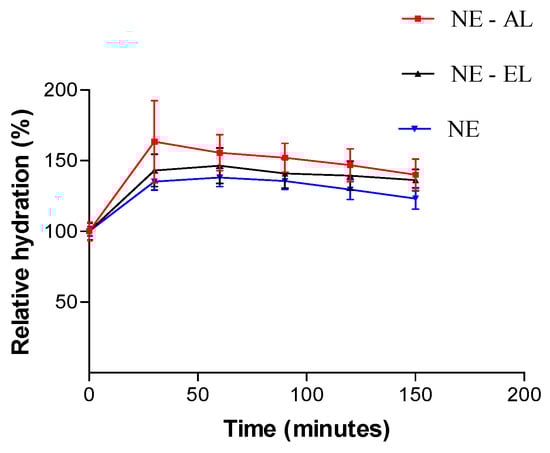 Both NE-AL and NE-EL showed a tendency to enhance stratum corneum hydration related to NE which had no lanolin derivatives (Figure 11). Although in Figure 12 it is possible to observe that NE-AL promoted greater hydration then NE-EL, there is no significant differences between them (p > 0.05). The results are in accordance with our expectance, since lanolin has emollient properties with high water absorption capacity, showing greater relative hydration related to nanoemulsions without lanolin derivatives.