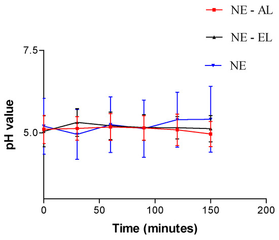 The addition of lanolin derivatives did not cause changes in pH values of the nanoemulsions (p > 0.05) in both EL and AL added systems, suggesting that the different chemical groups in the additives did not interfere with the initial nanoemulsion pH values.