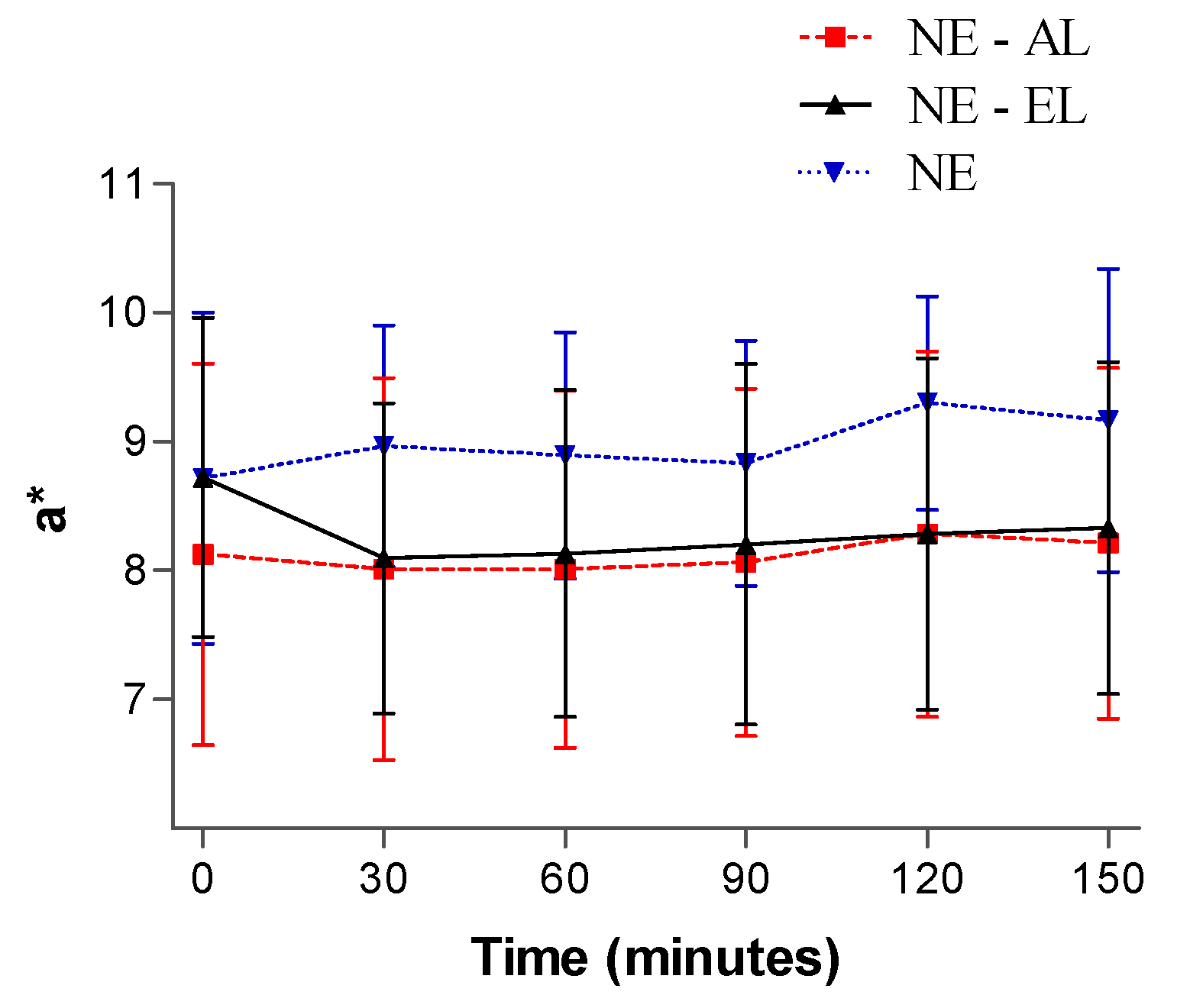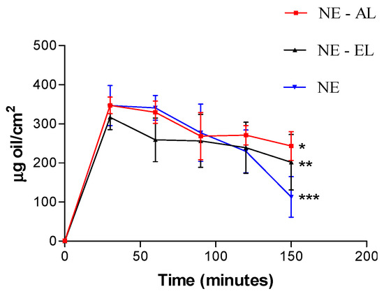 Skin oiliness in function of time after nanoemulsion application. * p < 0.05 vs NE-AL in time 0, 30, 60, 90 and 120 min. ** p < 0.05 vs. NE-EL in time 0, 30, 60, 90 and 120 min. *** p < 0.05 vs. NE in time 0, 30, 60, 90 and 120 min.