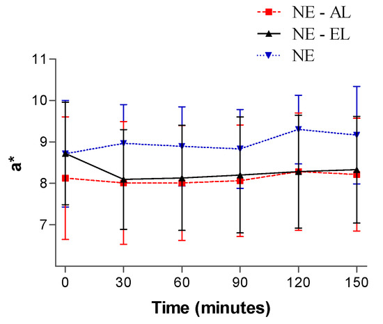 The results of color variation (a* parameter) did not reveal statistically significant alterations (p < 0.05) as a function of time for any of the tested nanoemulsions, indicating that they did not promote irritation of the skin during the tests (Figure 15).