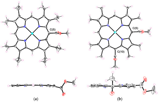 Crystal structures of (a) 11Zn; (b) 12Zn. Upper: top view; lower: side view. β-substituents of the side views are omitted for clarity. The thermal ellipsoids are set at the 50% probability level.
