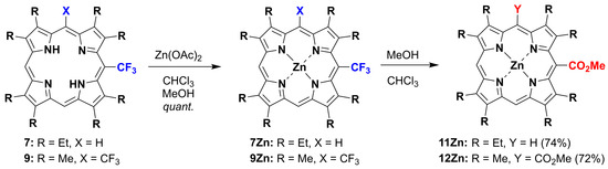 Single crystals of zinc complexes 7Zn and 9Zn were grown from CHCl3 solutions by vapor diffusion of methanol. Initially, we believed that we obtained crystals of 7Zn and 9Zn suitable for X-ray diffraction analyses. However, the data generated unusual electron density maps that were different from those of the expected structures. Surprisingly, solvolytic side reactions had occurred such that the CF3 substituents were converted into methoxycarbonyl (CO2Me). Isolated 7Zn and 9Zn also undertook solvolyses without excess zinc salts (Scheme 3), whereas the other metal complexes (Cu, Ni, Pd) did not cause under the similar conditions. Solutions of 11Zn and 12Zn in CHCl3 or other common organic solvents were red in color, as is often seen in the case of common β-alkyl substituted porphyrin zinc complexes. As illustrated in Figure 1, the UV-visible absorption spectrum of 9Zn exhibited a Soret band at 429 nm, which was red-shifted compared to that of the corresponding free base 9, while the lowest energy Q-band was at 623 nm. On the other hand, both the Soret and the Q-bands of 11Zn and 12Zn were remarkably blue-shifted compared to those of 9Zn (406, 537, 574 nm for 11Zn; 409, 541, 577 nm for 12Zn, Table 1), indicating the absence of electronic communication between the macrocycle and the meso-side chain; namely, there was no extension of the π-conjugation in such a system [12].