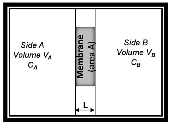 Integrating Fick’s laws, and associated boundary limits, with the discussion on role of secondary interactions and membrane thickness, one can envision a solution to these equations that can be understood as schematically and mathematically shown (Figure 3 and Equation (6)). Assuming that the initial concentration of solute in compartment A, , is equal to while the one in compartment B is zero (Figure 3), then the solution becomes [39]: