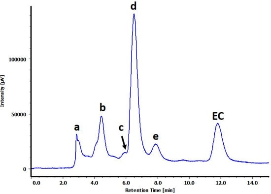 HPLC chromatogram of the reaction mixture obtained following oxidation of epicatechin (EC) (monitored at 280 nm). Peaks were shown as a–d. a: dehydrotricatechin B2 (5), b: dehydrotricatechin B1 (6), c: epicatechin-6′,6-dimer (2), d: epicatechin-6′,8-dimer (3), e: dehydrotricatechin A (4), EC: epicatechin (1).