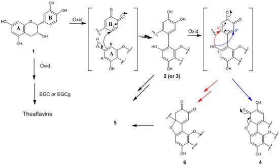 On the basis of the chemical structures of compounds 2–6, we proposed mechanisms for the formation of these compounds from 1, as shown in Figure 4. When 1 is treated with an oxidizing agent, the catechol-type B-ring is oxidized to form O-quinone. The nucleophilic addition of the B-rings of epigallocatechin and epigallocatechin gallate to O-quinone occurs because of their high electron density, and eventually leads to the formation of theaflavins [11]. On the other hand, the nucleophilic addition of 1 to O-quinone occurs at the A-ring because of its higher electron density compared with that of the B-ring. Nucleophilic addition at the C8 or C6 position results in the formation of dimers, such as compounds 2 and 3, or trimers, such as compound 5. Furthermore, the catechol unit of the resulting product can be oxidized again to O-quinone and converted to compound 4 by intramolecular cyclization of the C7-hydroxy group with the C5′ position. Intramolecular cyclization can also occur with the C1 position to generate compound 6. Compound 4 is converted into compound 5 through a ring opening reaction caused by aromatization. This formation mechanism suggested that the polymerization of catechin results from its oxidation, and further oxidation of these products results in the formations of compounds such as 4 and 6.