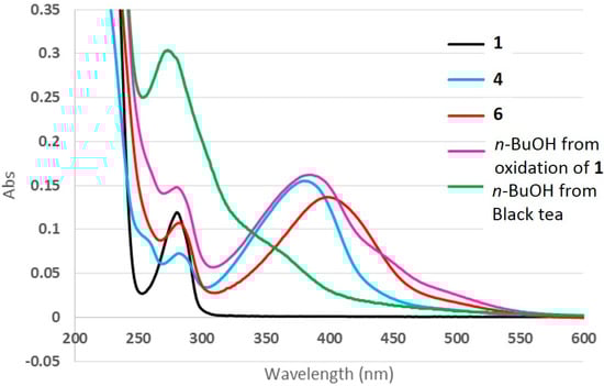 Thearubigins are the most abundant pigments in black tea and are formed by enzymatic oxidization of catechins during the fermentation process. These compounds are polymeric polyphenols with unresolved structures [2,3,4]. To obtain the UV-Vis spectrum of these compounds, the hot water extract of black tea leaves was extracted using ether, EtOAc, and n-BuOH, in the listed order, and the n-BuOH extract was further fractionated into two fractions (Fr. 1 and 2) using a Toyopearl HW-40C column. The UV-Vis spectrum of Fr. 2, which had a reddish-brown color, showed a wide absorption band in the 300–500 nm region, similar to that of the n-BuOH extract of the oxidation mixture of 1 described above. The absorption band of the black tea extract was observed at 360 nm, which was somewhat blue-shifted in comparison to those of compounds 4 and 6 and the n-BuOH extract of the oxidation mixture of 1. It is assumed that this difference is because thearubigins from black tea are a complex mixture that contains some products formed by conjugation between catechin and other components in addition to polymers derived only from catechins.