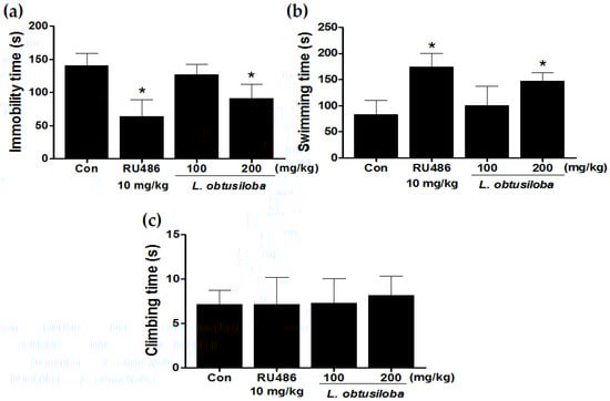 Antidepressant-like effects of treatment with L. obtusiloba extracts on depressive behavior in response to the FST. Immobility (a); swimming (b); and climbing (c) were recorded during the last 4 min in the FST. Columns show the means ± SEMs (n = 10). * p < 0.05 vs. the control group.