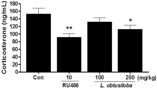 Effects of L. obtusiloba extracts on serum corticosterone levels. Blood samples were collected via the abdominal aorta after the FST for corticosterone analysis. Columns show the means ± SEMs (n = 10). * p < 0.05 and ** p < 0.01 vs. the control group.