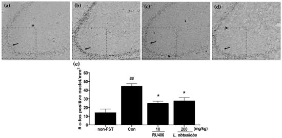 To examine whether L. obtusiloba extracts affected the neural responses in rats exposed to FST, c-Fos expression was measured in the hippocampus using immunohistochemistry. Increased activation of c-Fos was observed in the CA3 region of the hippocampus following the FST in vehicle-treated rats. c-Fos expression in RU 486–treated rats was similar to that previously reported for stress-induced c-Fos expression in the CA3 region of the hippocampus [17]. Importantly, treatment with 200 mg/kg L. obtusiloba extracts significantly inhibited c-Fos activity as compared with that in the vehicle-treated control group (Figure 3).