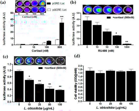 We have carried out the GR transactivation in the presence of glucocorticoids using the luciferase reporter assay. HeLa cells transfected with pGRE-Luc were treated with cortisol, at an indicated concentration. Then, 36 h after cortisol treatment, the cells increased luciferase reporter activity in a concentration-dependent manner with a statistical significance in cortisol treatment of 500 nM compared with non-treatment. At a concentration of 500 nM, transfected cells with pGRE-Luc exhibited a 4.1-fold greater GR transactivation compared to pΔGRE-Luc–transfected cells (*** p < 0.001; Figure 4a). Then, HeLa cells harboring the GRE-Luc construct were treated with a GR antagonist, RU 486, 3 h before 500 nM corticosterone treatment. The RU 486 strongly blocked cortisol-activated GR transactivation in a concentration-dependent manner. At a concentration of 1000 nM, RU 486 showed a 21.52-fold greater transrepressive effect compared with non-treatment (** p < 0.01; Figure 4b). Importantly, the addition of L. obtusiloba extracts decreased in cortisol-activated GR transactivation in a concentration-dependent manner. At a concentration of 100 µg/mL, L. obtusiloba extracts significantly decreased in luciferase activity, showing a 2.73-fold transrepressive effect (** p < 0.01; Figure 4c). The inhibition of cortisol-mediated GR transactivation by L. obtusiloba extract treatment did not appear to be influenced by inhibition of cell viability (Figure 4d).