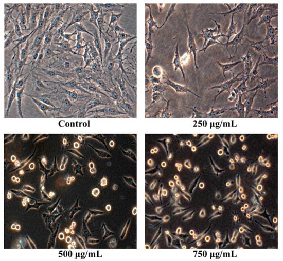 Morphology observation of MG63 cells. Cells treated with serial concentrations of PZH (250, 500 and 750 µg/mL) for 24 h were observed, * p < 0.05, ** p < 0.01 as compared with control.