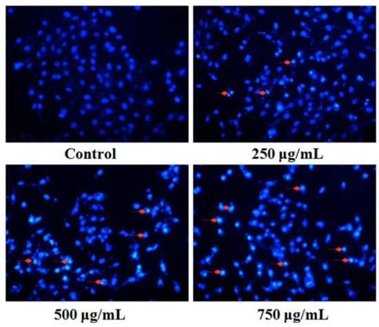 Fluorescent staining of MG63 cells with DAPI. Cells treated with serial concentrations of PZH (250, 500 and 750 µg/mL) for 24 h were stained with DAPI solution. Apoptotic body was labeled with red arrows.