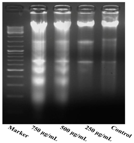 As shown in Figure 5, the results indicate a significant increase in inter-nucleosomal DNA fragmentation of MG63 cells. The DNA extracted from different concentrations of PZH-treated cells was subjected to agarose gel electrophoresis. No DNA fragmentation occurred in the control cells, while a DNA ladder characteristic of apoptosis was observed in the cells treated with PZH, especially 500 μg/mL, 750 μg/mL.