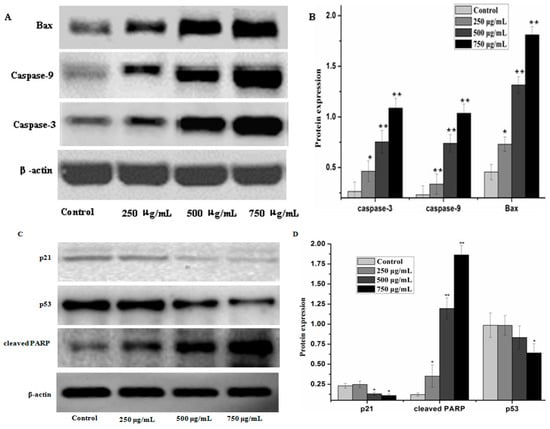 PZH-induced activation of caspase-3, caspase-9, p21, p53, cleaved-PARP and regulation pro-apoptotic protein Bax. The relative optical densities were indicated in B and D. Cells were treated with 250, 500 and 750 µg/mL PZH for 24 h and then were lyzed for the determination of the indicated protein levels by western blot. Actin was used as internal control. * p < 0.05, ** p < 0.01 vs. control group. Data are mean ± SD. (A) Protein expresion of Bax, caspase-3 and caspase-9; (B) The relative optical densities of Bax, caspase-3 and caspase-9; (C) Protein expresion of p21, p53 and cleaved-PARP; (D) The relative optical densities of p21, p53 and cleaved-PARP.