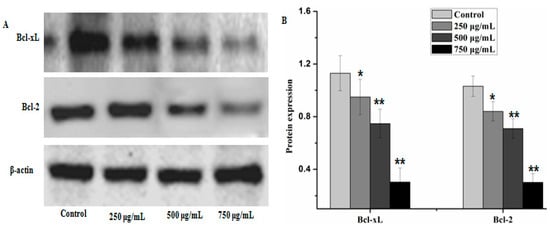 PZH inhibited anti-apoptotic protein Bcl-2 and Bcl-xL. The relative optical densities were indicated in B. Cells were treated with 250, 500 and 750 µg/mL PZH for 24 h and then were lyzed for the determination of the indicated protein levels by western blot. Actin was used as internal control. * p < 0.05, ** p < 0.01 vs. control group. Data are mean ± SD. (A) Protein expresion of Bcl-2 and Bcl-xL, (B) The relative optical densities of Bcl-2 and Bcl-xL.