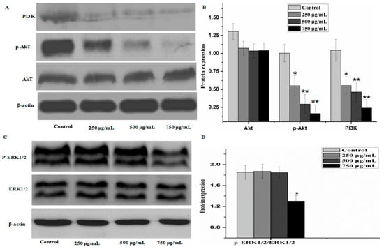 PZH triggered activation of PI3K/Akt signal pathway signaling. The relative optical densities were indicated in B and D. Cells were treated with 250, 500 and 750 µg/mL PZH for 24 h and then were lyzed for the determination of the indicated protein levels by western blot. Actin was used as internal control. * p < 0.05, ** p < 0.01 vs. control group. Data are mean ± SD. (A) Protein expresion of PI3K, p-AKT and AKT; (B) The relative optical densities of PI3K, p-AKT and AKT; (C) Protein expresion of ERK1/2 and p-ERK1/2; (D) The relative optical densities of ERK1/2 and p-ERK1/2.
