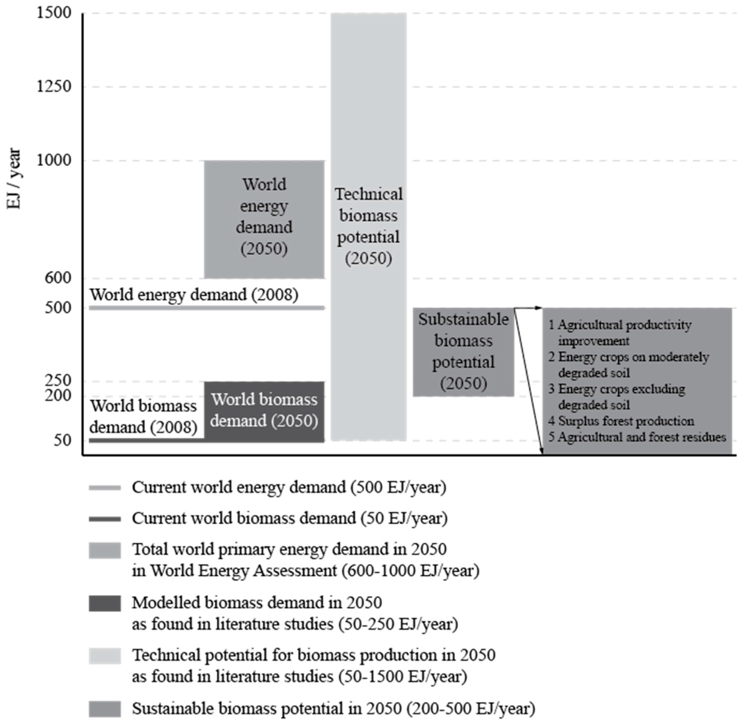 Projected world primary energy demand by 2050 is expected to be in the range of 600 to 1000 EJ/year compared to about 500 EJ in 2008. The expert assessment suggests potential deployment levels of bioenergy by 2050 in the range of 100–300 EJ/year. However, there are large uncertainties in this potential, such as market and policy conditions, and there is strong dependence on the rate of improvements in the agricultural sector for food, fodder and fibre production and forest products. The entire current global biomass harvest would be required to achieve a 200 EJ/year deployment level of bioenergy by 2050. Scenarios looking at the penetration of different low carbon energy sources indicate that future demand for bioenergy could be up to 250 EJ/year [21] It is reasonable to assume that biomass could sustainably contribute between a quarter and a third of the future global energy mix (Figure 4). The total annual aboveground net primary production (the net amount of carbon assimilated in a time period by vegetation) on the Earth’s terrestrial surface is estimated to be about 35 Gt carbon, or 1260 EJ/year assuming an average carbon content of 50% and 18 GJ/t average heating value [22], which can be compared to the current world primary energy supply of about 500 EJ/year [14]. All harvested biomass used for food, fodder, fibre and forest products, when expressed in equivalent heat content, equals 219 EJ/year [23]. The global harvest of major crops (cereals, oil crops, sugar crops, roots, tubers and pulses) corresponds to about 60 EJ/year and the global industrial roundwood production corresponds to 15 to 20 EJ/year [24].