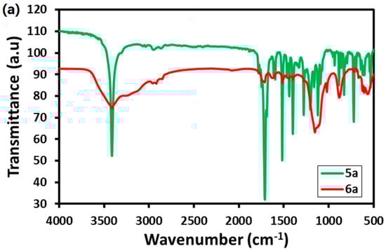 Furthermore, the FT-IR spectra of the imides-modified compounds (5a to 5c) is compared to the FT-IR spectra of zinc complexes of the imide derivative of polyacrylic acid (6a to 6c) as shown in Figure 2a–c to confirm the formation of the final composites. As per the literature, zinc is reported to produce a shift in the expected IR values by affecting the electron density in the bonded atoms and also has the capability to block out other prominent peaks [39]. Clearly, as shown in Figure 2a–c, some of the peaks are either missing from the spectra of final composites or they have slightly shifted from the original positions due to the addition of zinc. This confirms the presence of zinc in the final composites and also the formation of zinc complexes of the imide derivative of polyacrylic acid 6a to 6c. For instance, Figure 2a shows the IR spectra of 5a and 6a. In the IR spectrum of 6a, the peaks at 528, 785, 933, 1071 and 1327 cm−1 are missing, whereas some other peaks are slightly shifted, such as the peak at 1746 cm−1 belonging to the C=O group; 1120 cm−1 related to the N-C band stretching in 5a is slightly shifted to 1740 cm−1 and 1152 cm−1, respectively, in the IR spectrum of 6a. Similar kinds of shifts are also observed in the IR spectra of 6b and 6c, as shown in Figure 2b,c, respectively. The detail information of other prominent IR peaks of the Compounds 5a to 5c and 6a to 6c are given below.