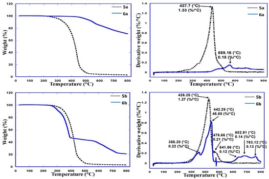 Weight loss percentage for the polymers Compounds 5a to 5c and 6a to 6c.