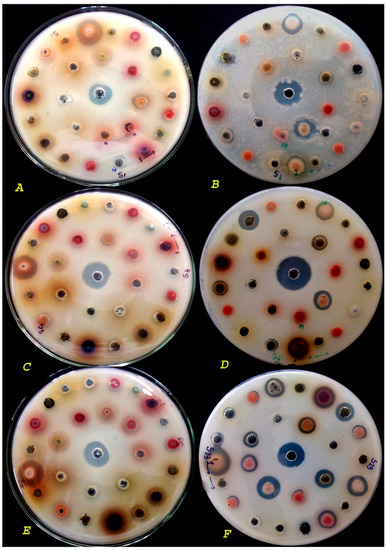 - Bauer, A.W.; Kirby, W.M.; Sherris, J.C.; Turck, M. Antibiotic susceptibility testing by a standardized single disk method. Am. J. Clin. Pathol. 1966, 45, 493–496. [Google Scholar] [PubMed]