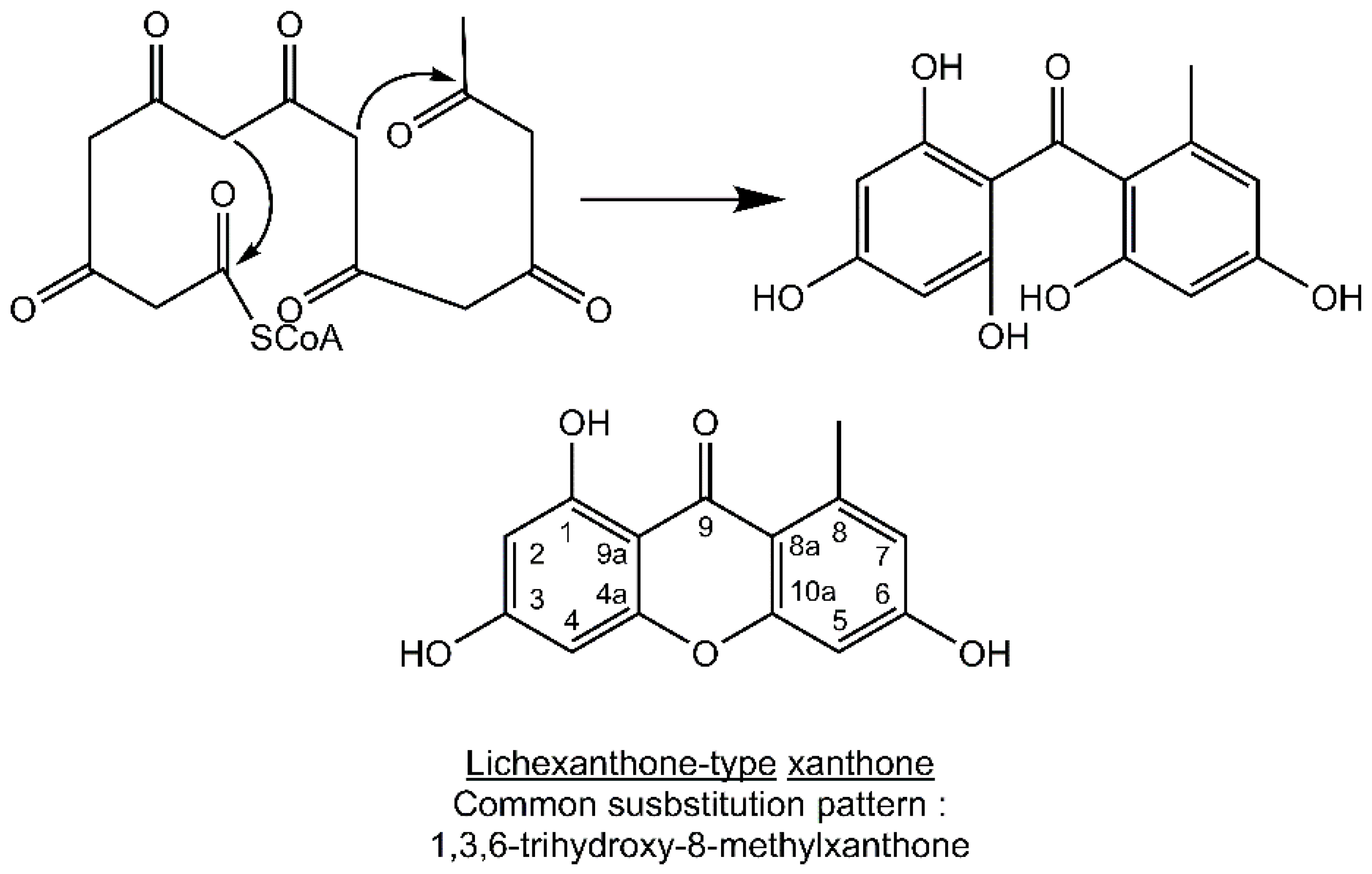 Most lichen xanthones arise through the folding of a polyketide intermediate as described by Cacho et al. [7], resulting in structures displaying a methyl group in position 8 (Figure 1). Aldol condensation and Claisen-type cyclization and release and yield a benzophenone intermediate that might spontaneously dehydrate to obtain the central pyrone core. This biosynthetic scheme gives rise to the common oxygen substitution pattern of lichexanthone and norlichexanthone (1,3,6-trihydroxy-8-methylxanthone).