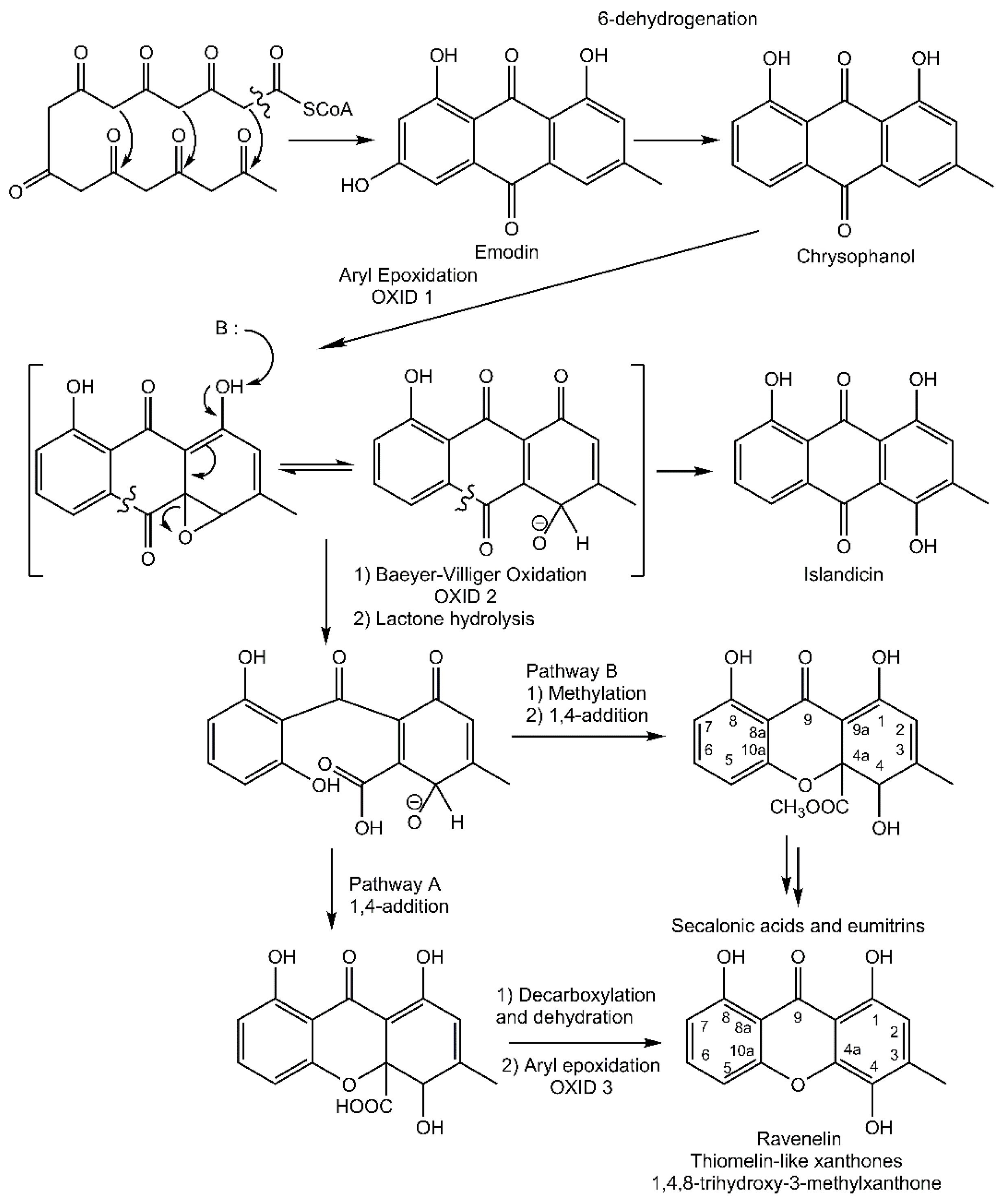 In contrast, a limited number of structures arise via a distinct biosynthetic pathway that leads to the ravenelin skeleton, with the methyl group in position 3. This biosynthetic scheme begins with the widespread anthraquinone emodin as a precursor [8] (Figure 2). To begin with, the hydroxyl group on C-6 of the emodin disappears (yielding chrysophanol) as it was observed in cell-free preparations of the fungus Pyrenochaeta terrestris [9,10]. The hydroxyl group on C-4 is then incorporated after the oxidative ring opens [11]. Deeper insights into this latter biosynthetic event were discussed by Henry and Townsend [12], who proposed an aryl epoxidation across an A-ring edge of chrysophanol to yield an intermediate that lost its A-ring aromaticity. Under this scheme, this intermediate, stabilized by a hydrogen bond between its newly formed phenol group and the neighboring quinone group, recovers its A-ring aromaticity to grant islandicin as a shunt product. An alternative for this intermediate is to undergo a second oxidation, most likely by the same P450 oxygenase, to afford a Baeyer-Villiger cleavage of the central quinone ring to yield an ortho carboxybenzophenone that might follow several metabolic fates. A first possibility is the 1,4-addition of a B-ring phenol to the A-ring dienone followed by dehydration and decarboxylation to access ravenelin-like xanthones after a final oxidation [12]. This results in xanthones displaying an archetypical 1,4,8-trihydroxy-3-methylxanthone skeleton. A second metabolic pathway, granting access to eumitrins and secalonic acids, is assumed to include a methylation of the carboxy group to prevent its subsequent elimination after a similar 1,4-addition. Finally, a subsequent 1,2-addition to the benzophenone intermediate leads to further cores similar to that of tajixanthone produced by Aspergillus variecolor, a skeleton thus far unknown from lichens.