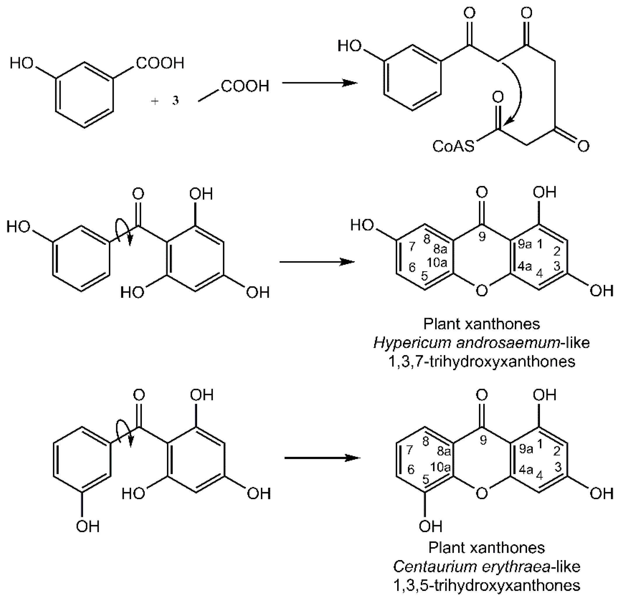 It is noteworthy that the xanthone nucleus of plants is of mixed biosynthetic origin with the A-ring being acetate-derived whereas shikimic acid pathway–derived 3-hydroxybenzoic acid gives rise to the C-ring (Figure 3). Aromatization of the side chain leads to a freely rotating benzophenone intermediate that can further cyclize to yield the xanthone core. Regioselective oxidative coupling can then yield a 1,3,7-trihydroxyxanthone (Hypericum androsaemum) or 1,3,5-trihydroxyxanthone (Centaurium erythraea) [4].