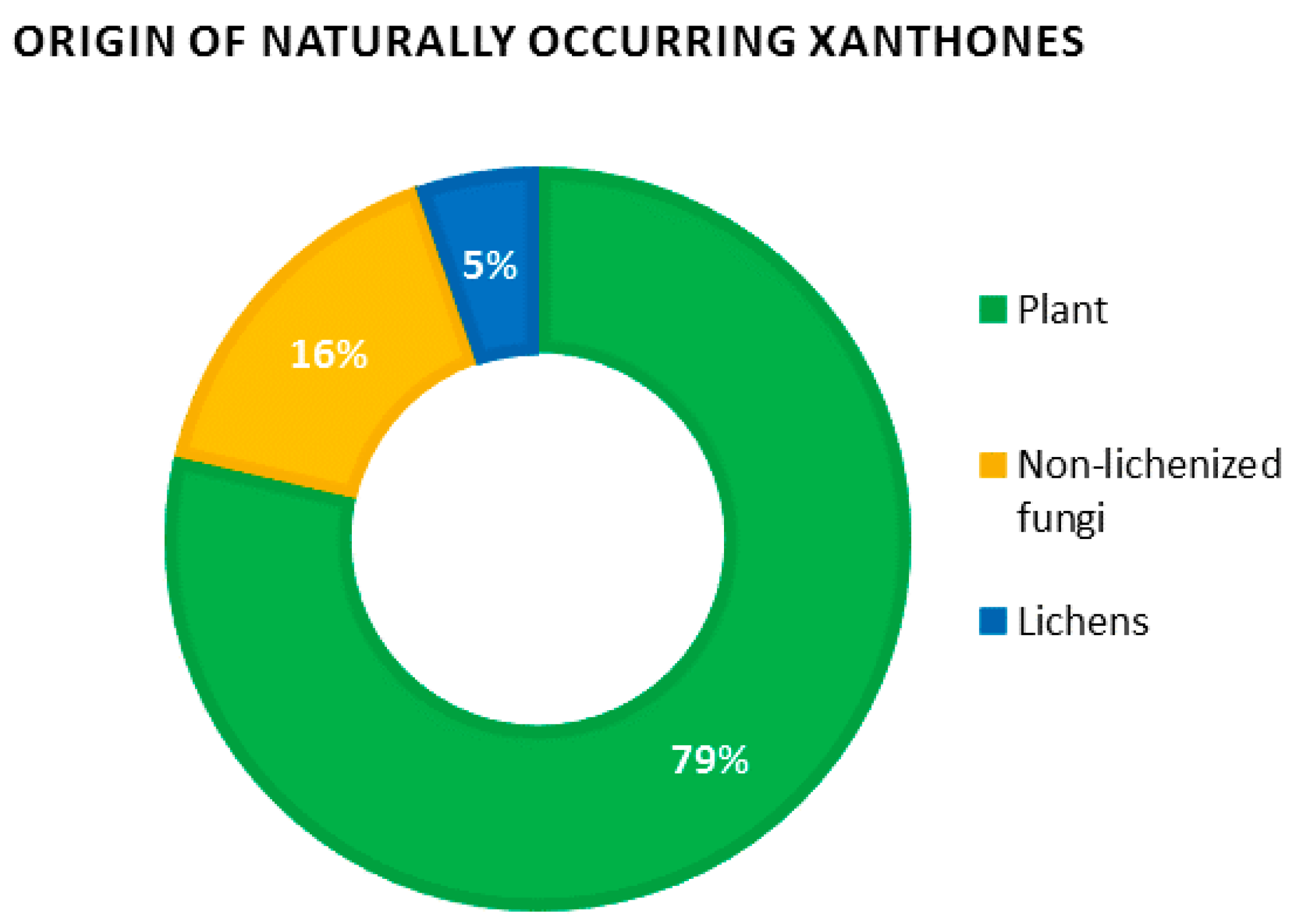 Likewise, very few xanthones are common to higher plants and fungi, with some such examples being 1,7-dihydroxyxanthone (known from the plants Vismia parviflora [25] and Weddelina squamulosa [26] while also being produced by a Penicillium strain [27]) 1,8-dihydroxy-3-methoxy-6-methylxanthone (plant Cassia obtusifolia [28] and fungus Astrocystis sp. BCC 22166 [29]), pinselin (plant Cassia occidentalis [30] and several fungal strains including an endophytic Phomopsis sp. [31], Talaromyces bacillosporus [32] and the marine-derived Engyodontium album [33]), 6-O-methyl-2-deprenylrheediaxanthone B (plant Garcinia vieillardii [34] and fungus Phomopsis sp. [31]), as well as 8-desoxygartanin (produced by both Garcinia mangostana and Streptomyces rishiriensis 265-P5921 (according to the Dictionary of Natural Products)). It can therefore be stated that xanthones are highly unique to each realm, legitimating joint efforts on higher plants, non-lichenized fungi and lichens to widen the chemical diversity of these privileged structures.