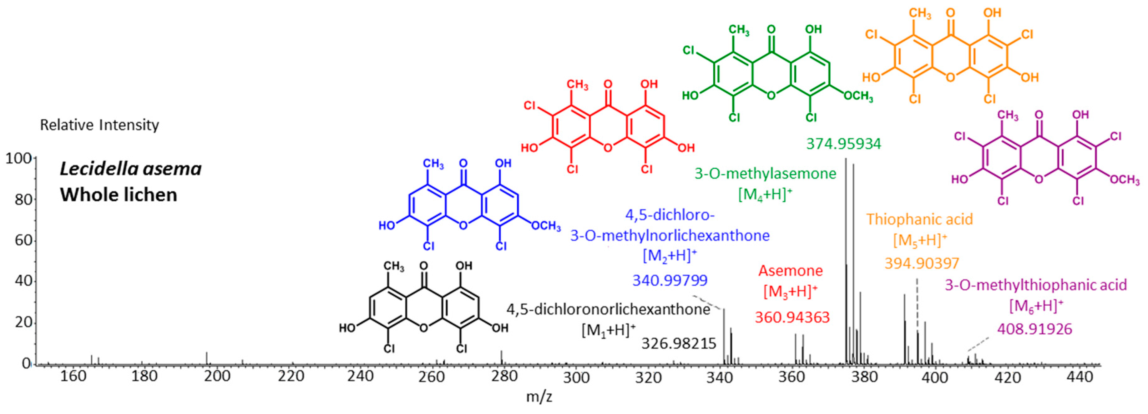 Although widespread among lichens, the long neglect of xanthones compared to other structural classes most likely arises from initial confusion in structural assignments between isomers and the subsequent difficulties in distinguishing the large number of co-occurring isomers [64]. However, the reliability of structural assignments tremendously increased over the last decades as refined dereplicative processes were developed. By 1993, a normalized reverse phase HPLC technique defined retention indices for 393 lichen products—including 55 xanthones—revealing that numerous xanthone isomers had different retention times [65]. Likewise, standardized TLC procedures were defined [66,67,68], with specific guidelines dedicated to xanthones [69]. A further enhancement of the normalized HPLC procedure was its subsequent hyphenation with a photodiode array detector to screen for xanthones based on their specific UV/Vis spectra [70]. As fluorescent substances, the color of lichen metabolites in long-wave UV light has been used for a long time as a hint to determine their structural class, especially for TLC. While the color of xanthones at such wavelengths is expected to range from bright yellow to orange, anthraquinones vary from bright red to vermillion and pulvinic acid derivatives appear yellowish [71]. At last, depsides and depsidones generally fluoresce blue to white or shades of grey, although atranorin gives a yellow hue [72]. Such features paved the way for fluorescence microscopy studies undertaken on semi-thin sections of lichens to explore the location of lichen metabolites across sections of a range of macrolichens [73]. However, an obvious limitation of this approach is that it only depends on the structural group scaffold and therefore it does not discriminate between individual compounds. Structural assignments have now been confirmed by the unambiguous synthesis of most lichen xanthones [74,75,76]. A further strategy to improve the information granted by the aforementioned separative techniques is the subsequent detection by mass spectrometry. If HPLC-MS of lichen extracts is now widely used for lichen dereplication, with the possible detection of xanthones, no TLC-MS reports have yet been made to the best of the authors’ knowledge [77]. To date, no standardized liquid chromatography-UV-mass spectrometry methodology has been published on lichen metabolites. However, a few non-specific lichen xanthones (lichexanthone, norlichexanthone, secalonic acid D) can be found in the fungal database established by Nielsen and Smedsgaard [78]. As far as mass spectrometry is concerned, various lichen xanthones were shown to be ionizable in negative-ion mode LDI-MS (Laser Desorption and Ionization), directly providing a complete chemical fingerprint from the complete acetone extract of the chloroxanthone-containing Lecidella asema, without the need for matrix assistance [79]. Lately, the ambient ionization technique DART-MS revealed its potent ability in examining lichen secondary metabolites in situ [80]. As shown below, the analysis of a whole piece of Lecidella asema shows an exhaustive chemical profile (Figure 5).