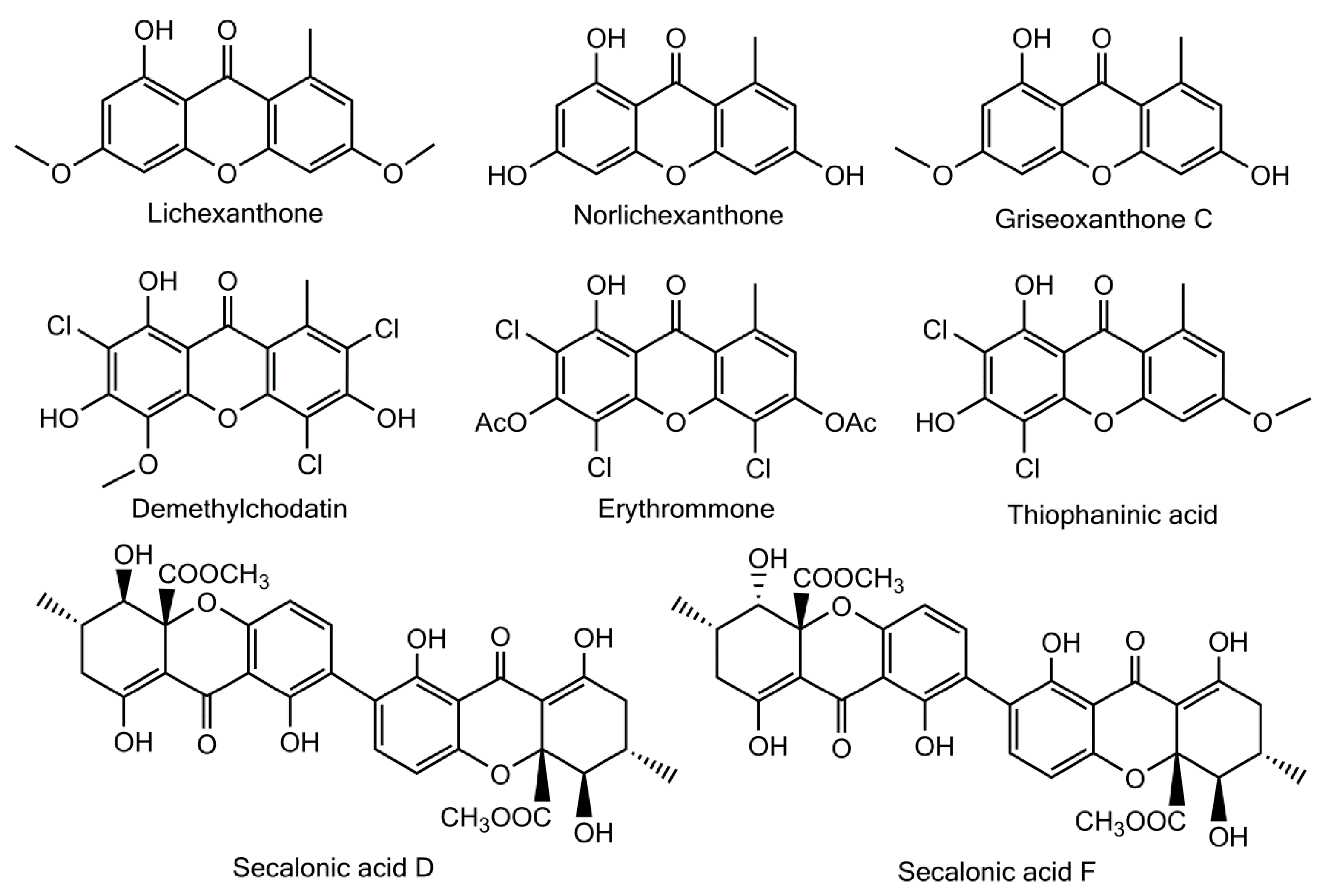 Given these different biosynthetic pathways, only few lichen xanthones are known from non-lichenized organisms. However, some can be produced by higher plants, such as lichexanthone (e.g., Anthocleista djalonensis [13], Croton cuneatus [14], Cupania cinerea [15], Feroniella lucida [16], Minquartia guianensis [17], Zanthoxylum microcarpum [18], Z. valens [18]), vinetorin (Hypericum ascyron [19]). Likewise, non-lichenized fungi have the ability to synthesize some lichen xanthones, such as lichexanthone from various Penicillium [20], norlichexanthone from Penicillium patulum [21] and the endolichenic fungus Ulocladium [22]; 1,3,6-trihydroxy-8-methylxanthone (also known as griseoxanthone C) is a precursor of aflatoxins—a group of significant environmental mycotoxins—first reported from Penicillium patulum [23]. Secalonic acids are also mycotoxins produced by a wide array of fungi [24].
