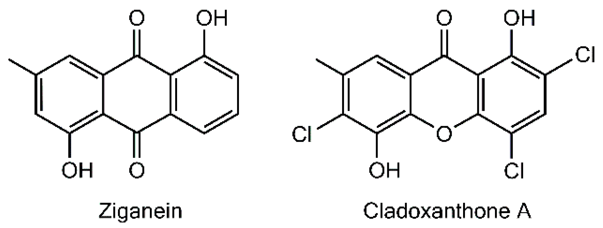 The last monomeric xanthone isolated so far from a lichen source is cladoxanthone A (=1,5-dihydroxy-2,4,6-trichloro-7-methylxanthone), obtained from Cladonia incrassata [115]. The occurrence of a methyl substituent on C-7 is an unprecedented structural feature among lichen xanthones, thus questioning the underlying biogenetic schemes. A possible hypothesis to account for the structure of this xanthone is to consider ziganein as a possible anthraquinone precursor [116]. It is noteworthy that this metabolite presents a substitution pattern identical to that of cladoxanthone A and it was isolated from the endophytic fungus Sporormiella minimoides [116] (Figure 7). Cladoxanthone A revealed an antibacterial effect towards Staphylococcus aureus even though the paucity of the compound precluded the determination of a minimal inhibitory concentration [115].