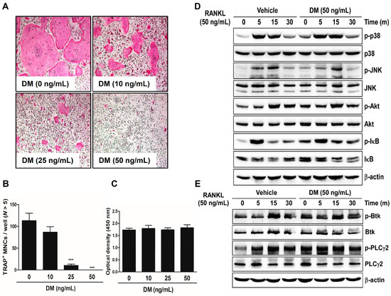 DM inhibits RANKL-induced osteoclast differentiation. (A) BMMs were cultured for 4 days with M-CSF (30 ng/mL) and RANKL (50 ng/mL) in the presence or absence of DM. Cells were fixed in 3.7% formalin, permeabilized with 0.1% Triton X-100, and stained with TRAP solution. TRAP-positive multinucleated cells (TRAP+ MNCs) were photographed under a light microscope; (B) TRAP+ MNCs with more than five nuclei were counted. *** p < 0.001 vs. control; (C) BMMs were seeded into a 96-well plate and cultured for 3 days in the presence of M-CSF (30 ng/mL) and with the indicated concentrations of DM. After 3 days, the absorbance was measured at 450 nm using an ELISA reader; (D,E) BMMs were cultured for 1 day in the presence of M-CSF (10 ng/mL). Afterwards, BMMs were starved for 3 h, pretreated with DM (50 ng/mL) for 1 h, and then stimulated with RANKL (50 ng/mL) for the indicated times. Cell lysates were analyzed by western blotting with antibody against p-p38, p38, p-JNK, JNK, p-Akt, Akt, p-IκB, IκB, p-Btk, Btk, p-PLCγ2, PLCγ2, and β-actin.