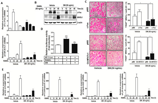 DM suppresses the expressions of c-Fos, NFATc1, and other osteoclast marker genes. (A) BMMs were stimulated with RANKL (50 ng/mL) and M-CSF (30 ng/mL) in the presence or absence of DM (50 ng/mL) for the indicated times. Total RNA was isolated from cells using QIAzol reagent; mRNA expression levels of c-Fos and NFATc1 were evaluated using quantitative real-time RT-PCR. *** p < 0.001 vs. control in the indicated time. *** p < 0.001 vs. control in the indicated time; (B) BMMs were pretreated with or without DM (50 ng/mL) for 1 h and then stimulated with M-CSF (30 ng/mL) and RANKL (50 ng/mL) for the indicated times. The cell lysates were analyzed by western blotting with c-Fos, NFATc1, and β-actin antibodies; (C) BMMs were infected with retroviruses expressing pMX-IRES-EGFP (pMX), pMX-CA-NFATc1-EGFP, and pMX-c-Fos-EGFP. Infected BMMs were cultured with or without DM (50 ng/mL) in the presence of M-CSF (30 ng/mL) and RANKL (50 ng/mL) for 4 days. After culturing, the cells were fixed and stained for TRAP (left). The TRAP+ MNCs with more than five nuclei were counted (right). * p < 0.05 vs. the indicated group; (D) HEK293T cells were cotransfected with RANK and AP-1 luciferase plasmid. At 12 h after transfection, the cells were pretreated with DM (50 ng/mL) or vehicle (DMSO) for 24 h and then stimulated with RANKL (100 ng/mL) for 24 h. The cells were lysed and the luciferase activity was assayed. ### p < 0.001 vs. RANKL-untreated group and *** p < 0.001 vs. RANKL-treated group; (E) BMMs were stimulated with RANKL (50 ng/mL) and M-CSF (30 ng/mL) in the presence or absence of DM (50 ng/mL) for the indicated times. Total RNA was isolated from the cells using QIAzol reagent; mRNA expression levels of Cathepsin K, β3-integrin, DC-STAMP, and Atp6vOd2 were evaluated using quantitative real-time RT-PCR. *** p < 0.001 vs. control at the indicated time.