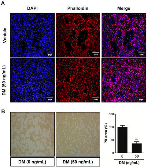 To obtain mature osteoclasts, BMCs and primary osteoblasts were co-cultured in collagen gel-coated culture dishes for 7 days in the presence of 1,25-dihydroxyvitamin D3 (VitD3; Sigma) and prostaglandin E2 (PGE2; Sigma). After 7 days, the co-cultured cells were detached using 0.1% collagenase at 37 °C for 10 min, and the separated cells were replated on hydroxyapatite-coated plates (Corning, New York, NY, USA) with or without DM (50 ng/mL) for 24 h. Afterwards, the cells on the plates were removed and the resorption pits were photographed and quantified using the Image-Pro Plus program version 4.0 (Media Cybernetics, Silver Spring, MD, USA).