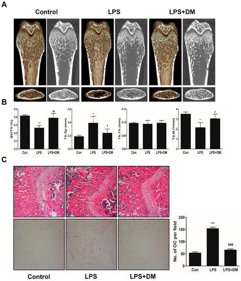 DM exhibits a restoration effect on LPS-mediated bone-loss mouse model. (A) Mice were sacrificed 8 days after the first LPS injection; 2D or 3D radiographs of the coronal and transverse planes of the proximal femora were obtained by μ-CT; (B) BV/TV, Tb.Sp, Tb.Th, and Tb.N of the femora were determined using the μ-CT data and analyzed using INFINITT-Xelis software. ** p < 0.01, *** p < 0.001 vs. control; # p < 0.05, ## p < 0.01 vs. LPS group; (C) Dissected femora were fixed, decalcified, embedded, and sectioned. Sections were stained with TRAP and H & E. The number of osteoclasts per field of tissue was measured by performing histomorphometric analysis. *** p < 0.001 vs. control; ### p < 0.01 vs. LPS group.
