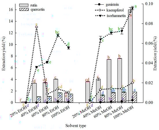 Solvent selection is important in the extraction of compounds from botanical materials [69]. Figure 1 shows that under similar extraction conditions. 100% MeOH was superior to other solvents in extracting rutin, genistein and isorhamnetin from FSI. Both 80% MeOH and 100% MeOH were superior to the other solvents in extracting quercetin, but without significant differences in their extraction yields (p ≤ 0.01). The 40% EtOH solvent was superior to the other solvents in extracting kaempferol.